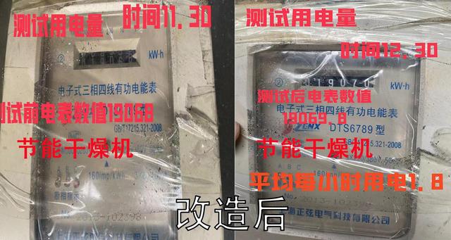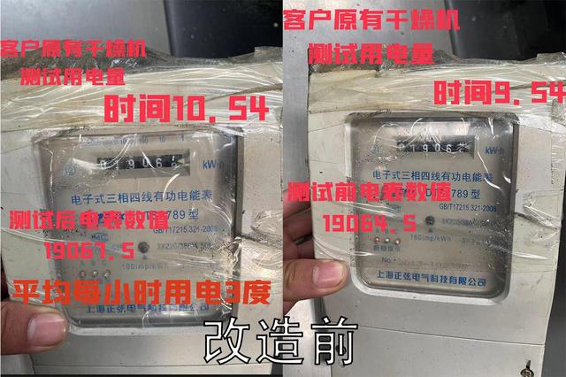 2020年1月,工程師團隊根據客戶要求,現場安裝了首批5臺安捷能塑料料斗干燥機改造設備,并根據客戶要求做了現場電表測試,現場測試節(jié)能率為42%,
