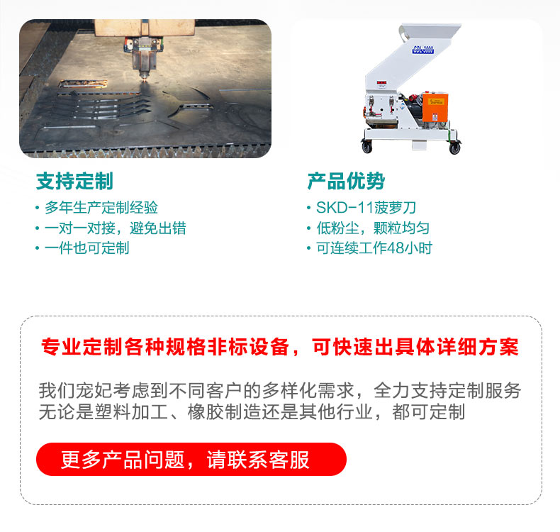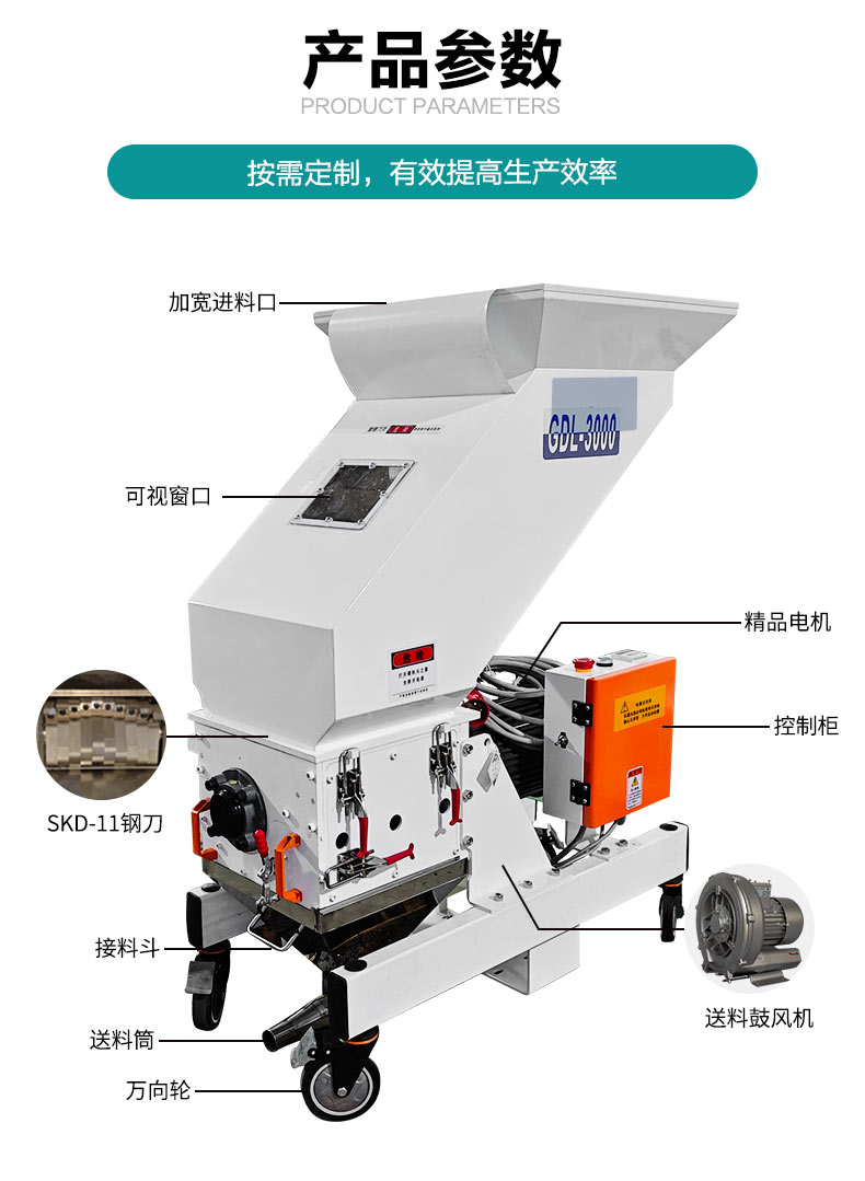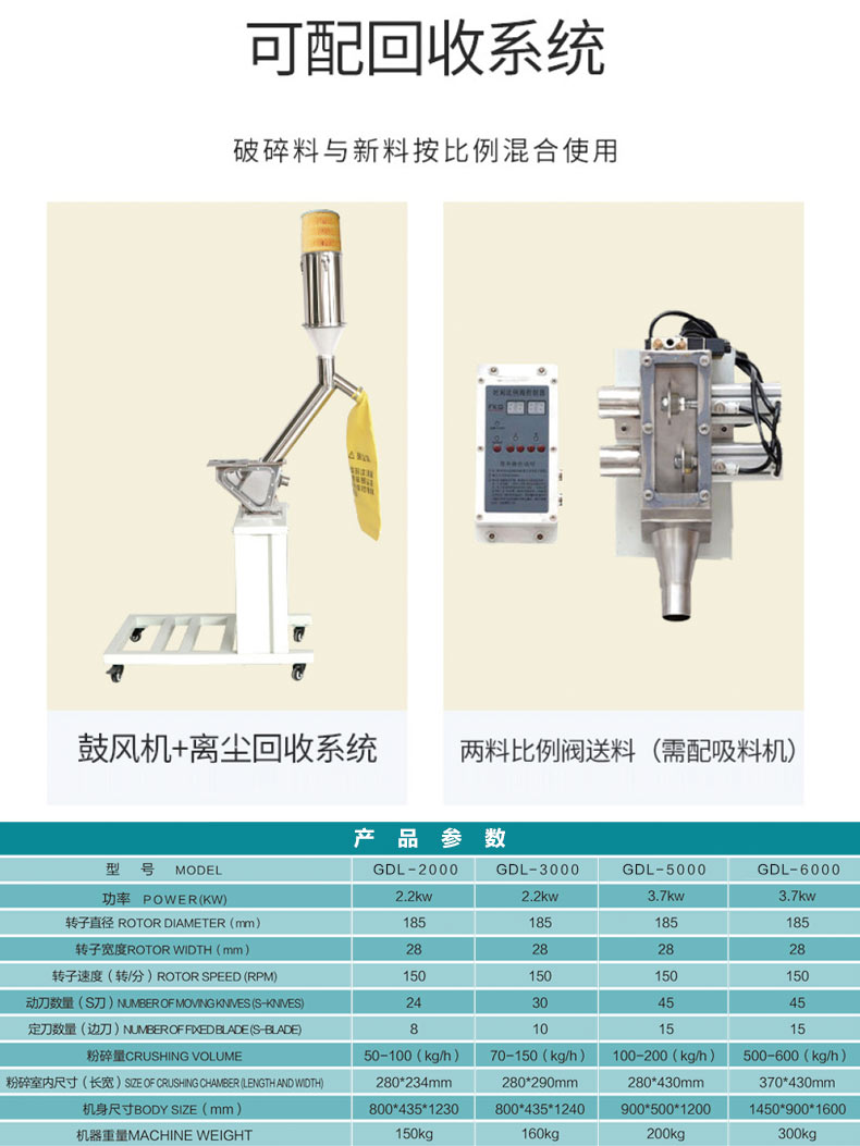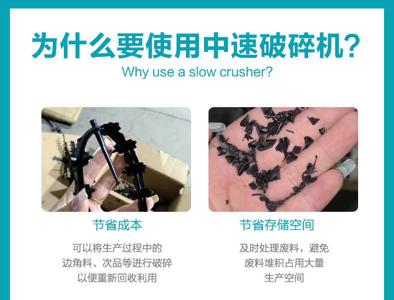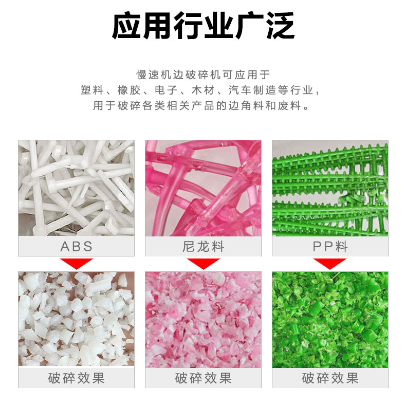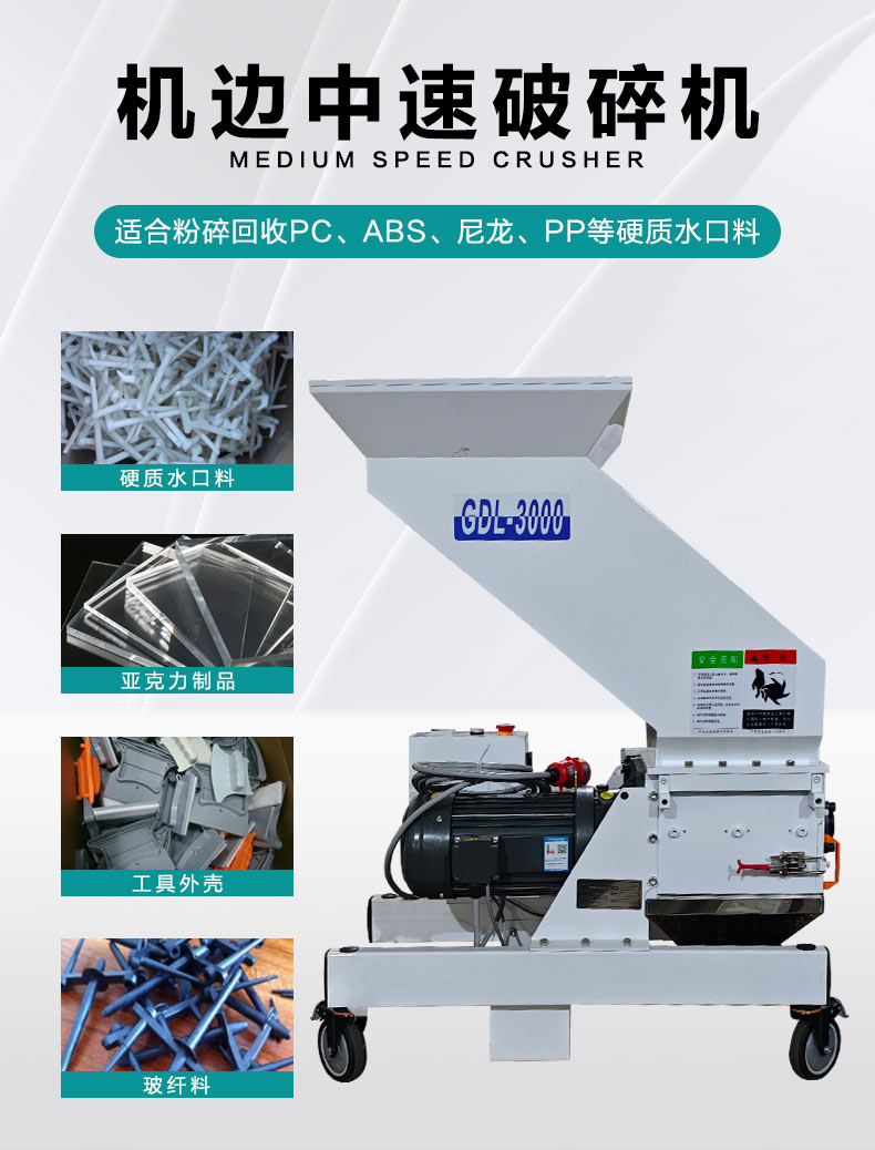 中速機(jī)邊粉碎機(jī)適合放置于機(jī)邊,與回收器、干燥機(jī)等配合使用,組成一套快速回收系統(tǒng)。此系統(tǒng)可省掉回收過程中繁雜的中間環(huán)節(jié),避免了因此所造成的人力、物料的浪費(fèi)從而達(dá)到回收效果。
